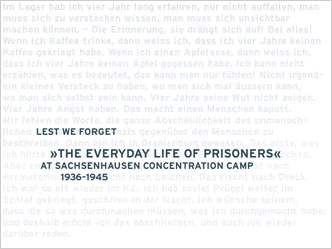 The CD-ROM »The everyday life of prisoners at Sachsenhausen concentration camp 1936 to 1945« is based on the experiences, actions and conduct of prisoners. It focuses on their subjective experience. Individual fates that differ as greatly as possible are presented in 20 biographies. Their presentation is arranged in six thematic areas. Parallel to this biographical material, users can directly enter six subjects, four of which [In the Company of Prisoners, Work, Time and Space, Violence, Dying and Death] relate to the time spent in the concentration camp, and two of which [The Path to Sachsenhausen, Living with the Memory] deal with the time before and after imprisonment.